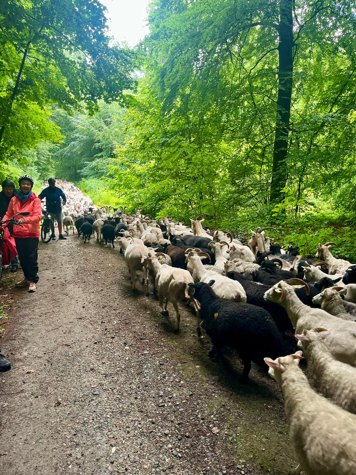 Hier, im Satrupholmer Wald, hatten sie ein Erlebnis besonderer Art. Etwa 1.000 Schafe, vermutlich mit der Schäferin Angela Dornis, aus der Schäferei Obere Treenelandschaft, durchquerten ebenfalls den Wald. 2 Hütehunde führten die Tiere an und einer sicherte den Rückweg. Und die Schäferin mittendrin. Ein herrlicher Anblick.
